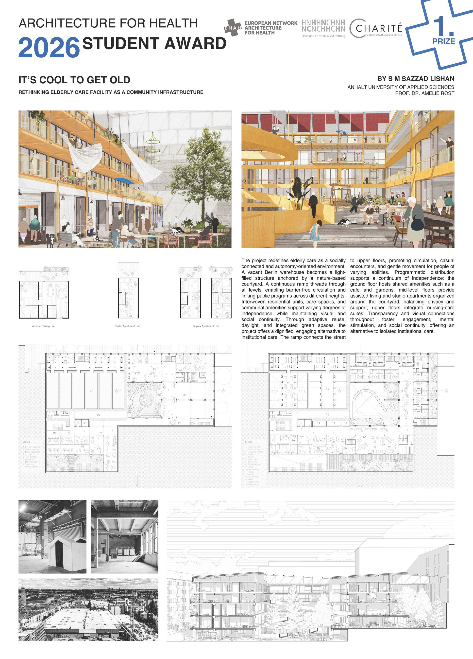 How do we want to live in old age? The jury recognises in this project a visually compelling and thoughtful approach to the design of facilities for elderly care. Set within a lively Berlin neighbourhood, the project redefines elderly care as a socially connected environment — a dignified and vibrant alternative to traditional institutional models. The jury particularly appreciates the project’s central premise: that people, even in old age, wish to remain within their familiar surroundings and community. Contemporary social and architectural themes, such as adaptive reuse and social diversity, are also addressed with sensitivity and clarity. The building is conceived as an open, well-integrated urban structure. With barrier-free design, service facilities distributed across multiple levels, integrated green spaces, and generous daylight in the living areas, the project achieves an exceptionally high quality of life for its residents.