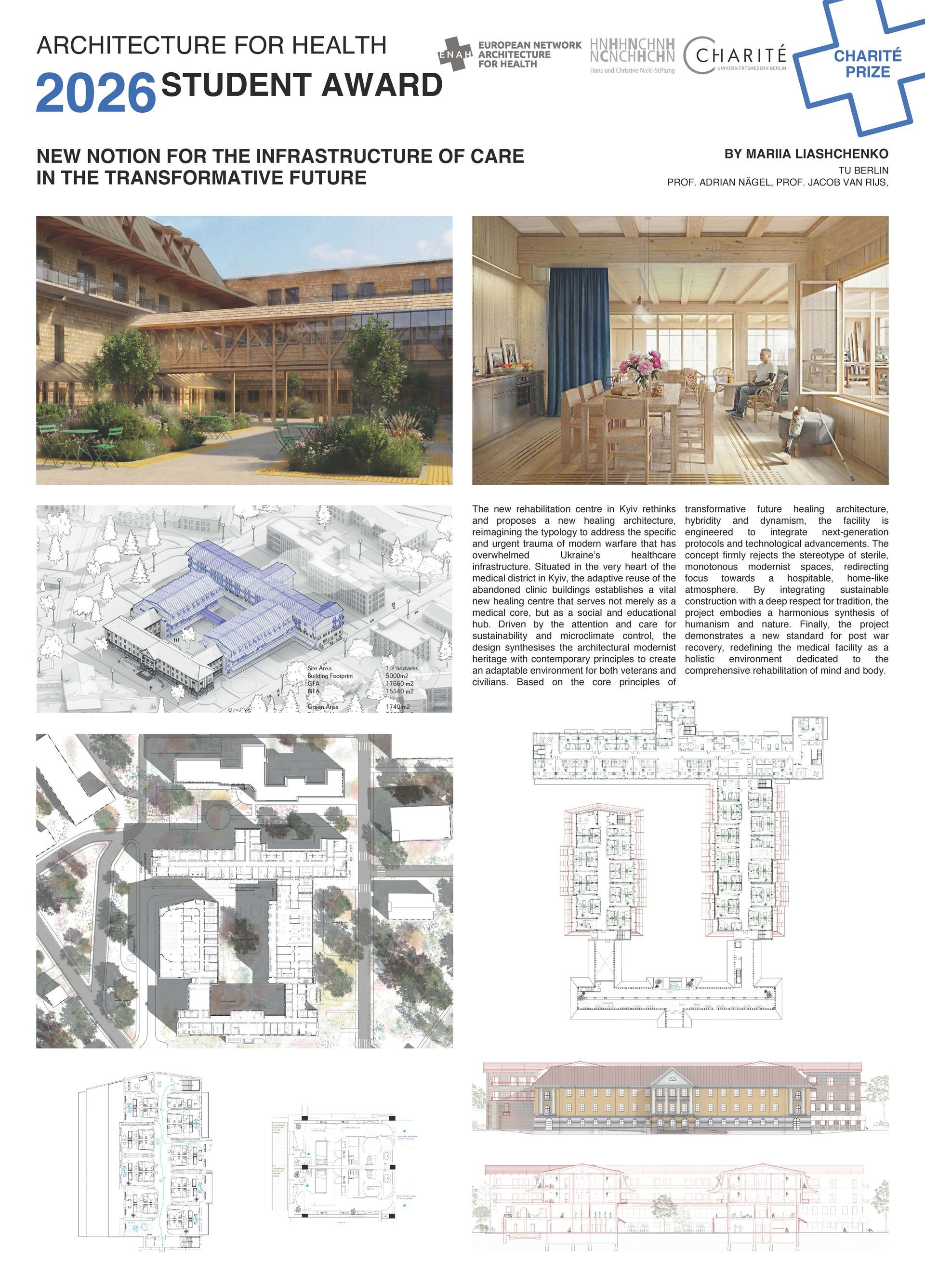 The project for a new rehabilitation centre in Kyiv is conceived as a trauma facility for patients in Ukraine. Located within Kyiv’s medical district, the adaptive reuse of abandoned clinic buildings establishes a new therapeutic centre, complemented by inclusive social and educational programmes. The jury particularly commends the project for its intensive engagement with the subject and its strong political relevance. The work addresses the humanitarian consequences of war with great sensitivity and explores, in depth, how architecture can contribute to their alleviation. This dual focus on architectural and humanitarian concerns is regarded as especially compelling. The jury further values the project’s engagement with themes of adaptive reuse and building within existing structures. Against this background, and in light of the project’s urgency and its significant social and therapeutic relevance, the jury has decided to award the work this year’s Charité Special Prize.